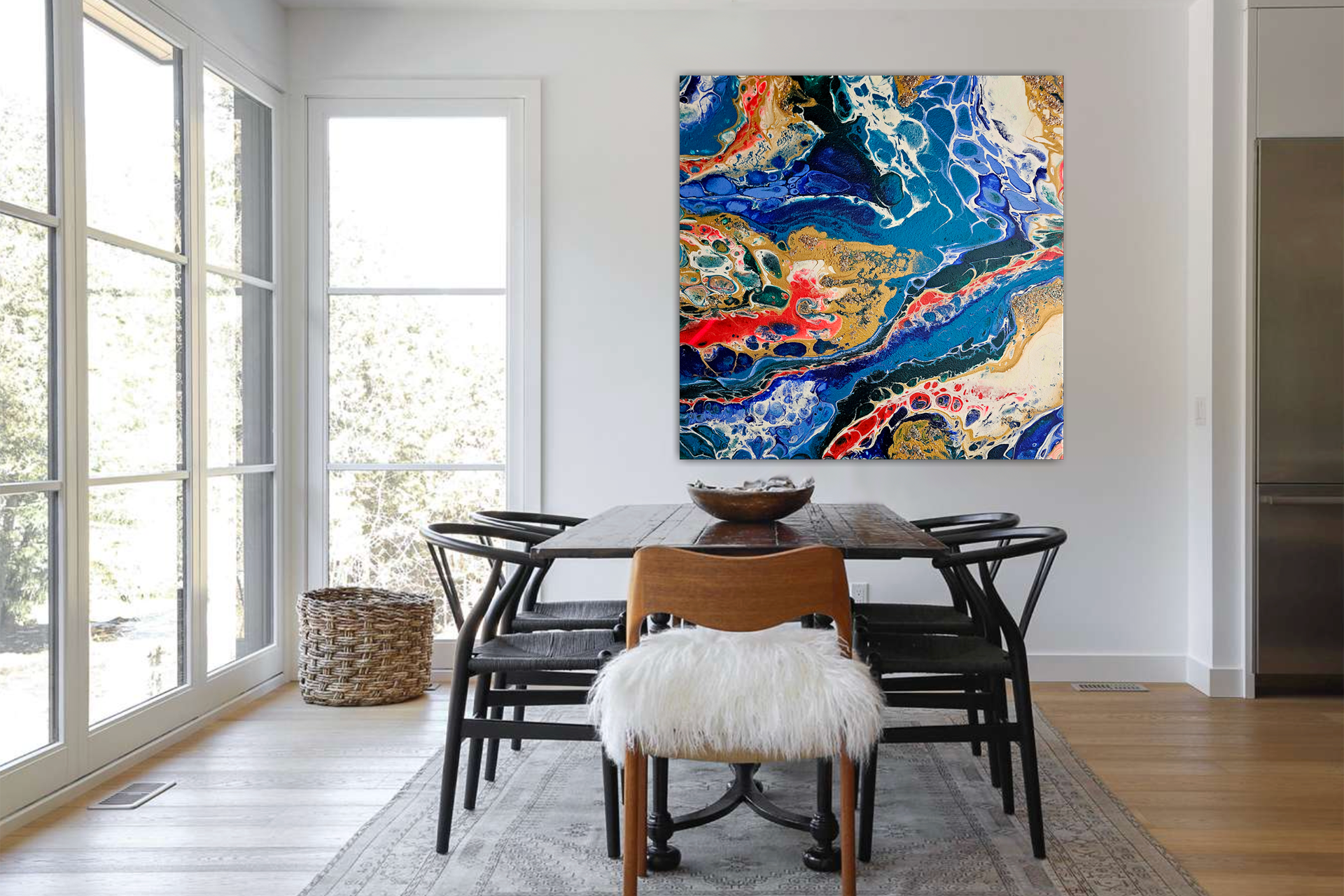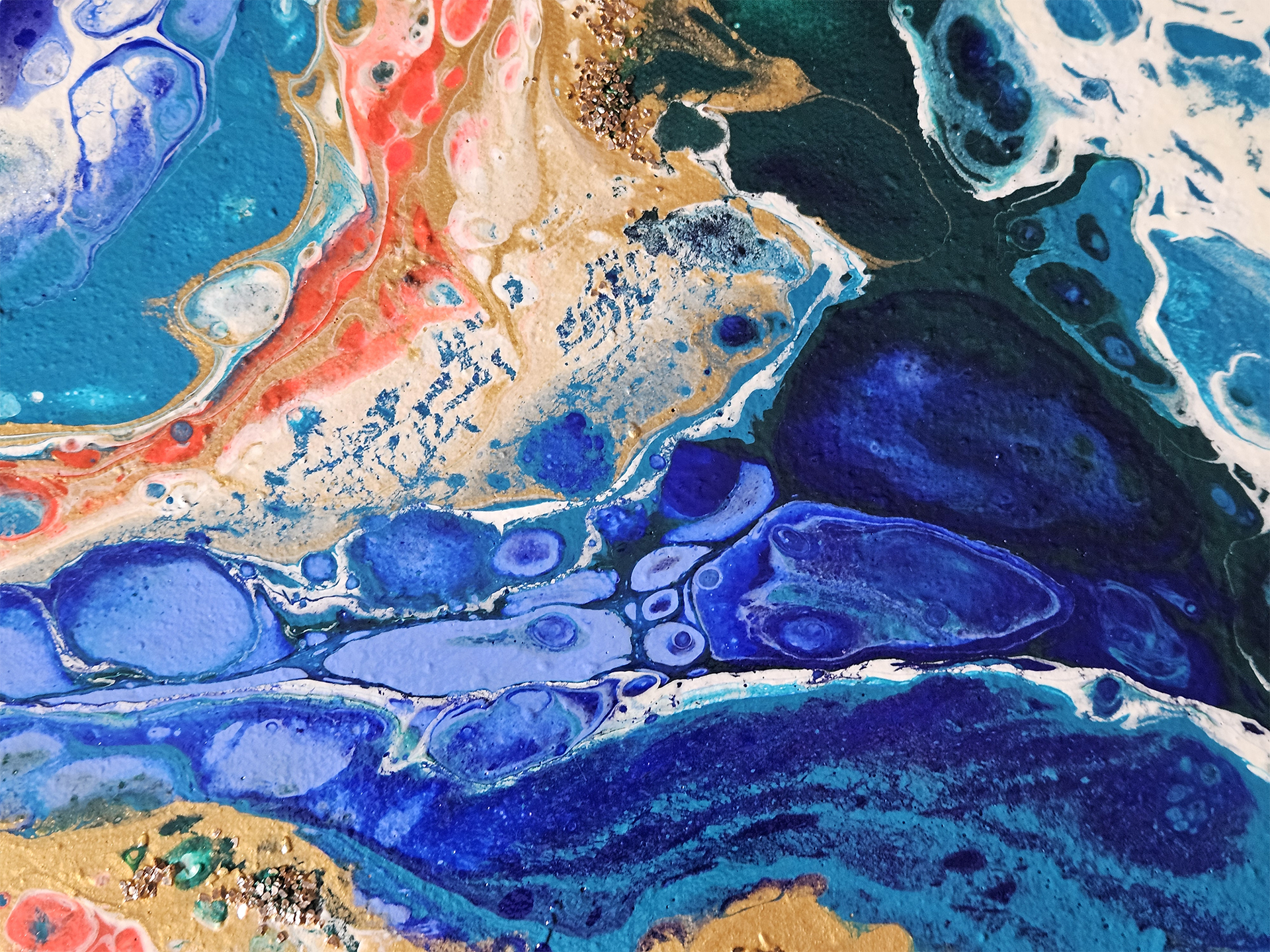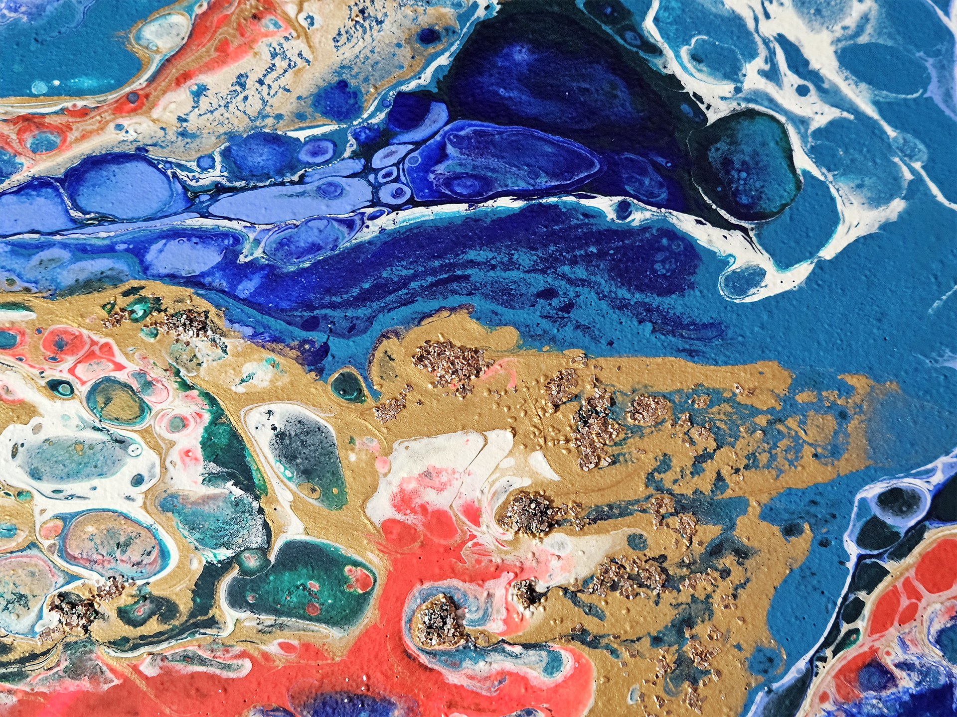 This acrylic painting is inspired by the calming deep blue sea. Incorporating a bold blend of fluorescent red, aquamarine blue, turquoise blue, light blue violet, emerald green, gold, white and black, with sections of glass gold glitter and glow in the dark glitter. Each piece is signed and comes with a certificate of authenticity.