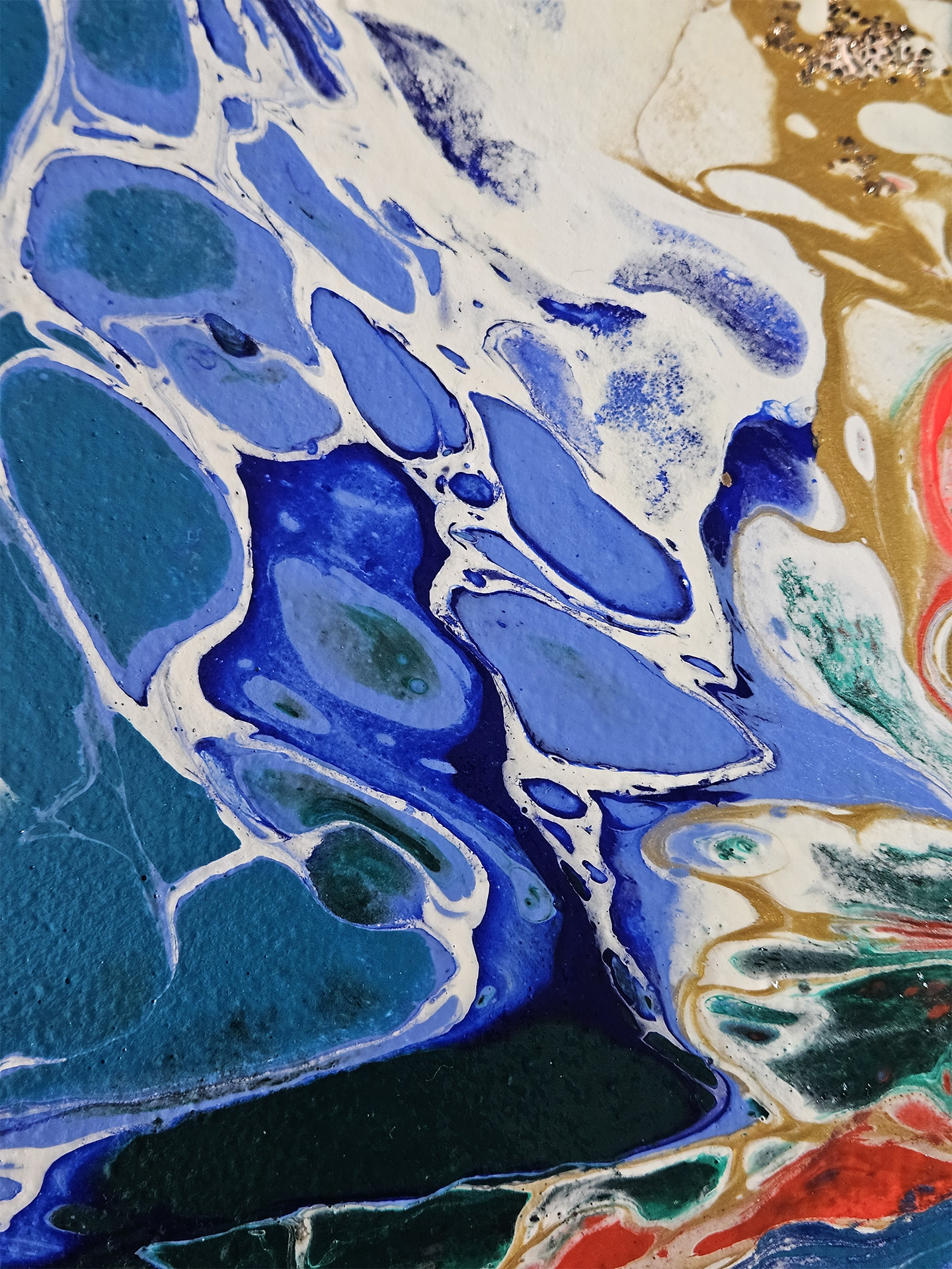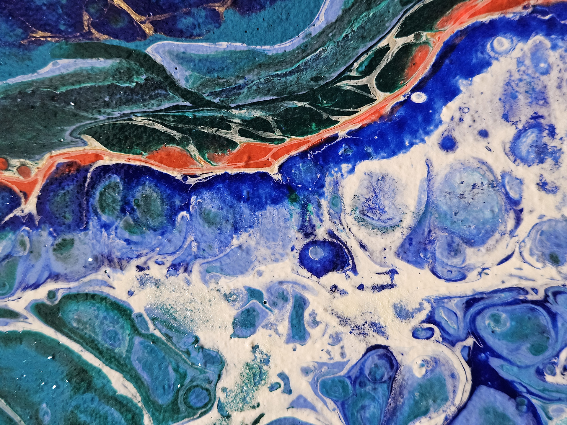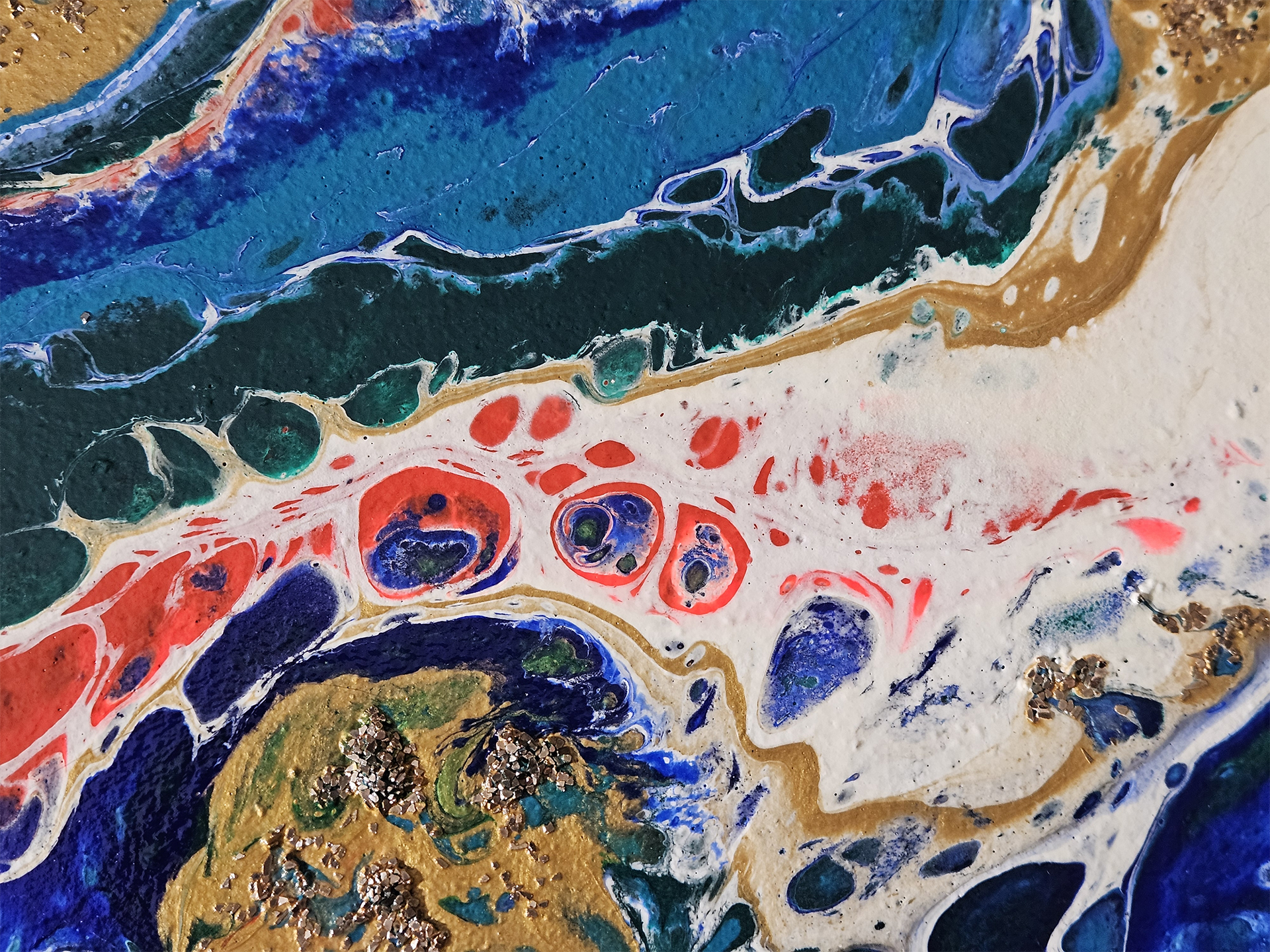 This acrylic painting is inspired by the calming deep blue sea. Incorporating a bold blend of fluorescent red, aquamarine blue, turquoise blue, light blue violet, emerald green, gold, white and black, with sections of glass gold glitter and glow in the dark glitter. Each piece is signed and comes with a certificate of authenticity.