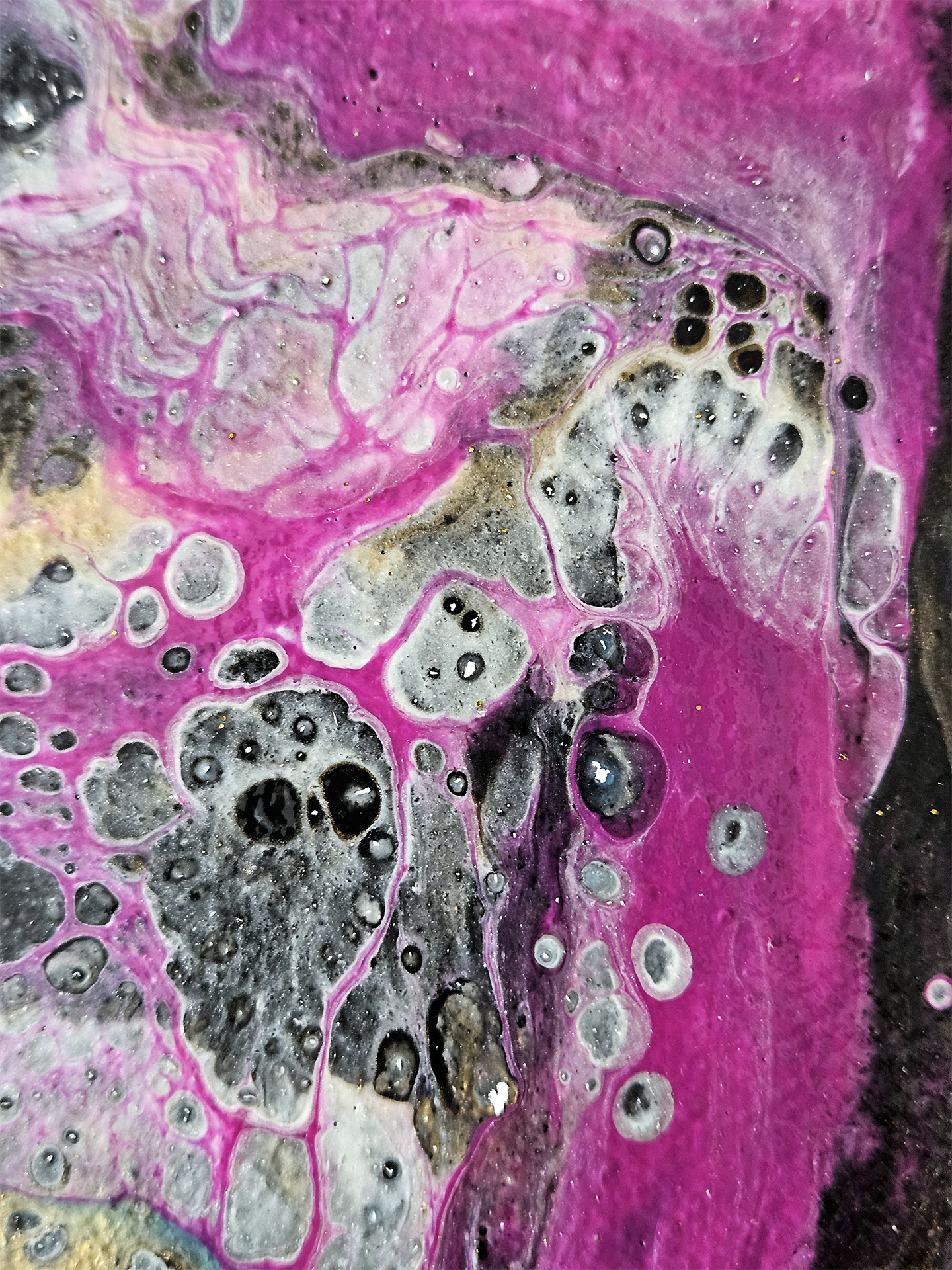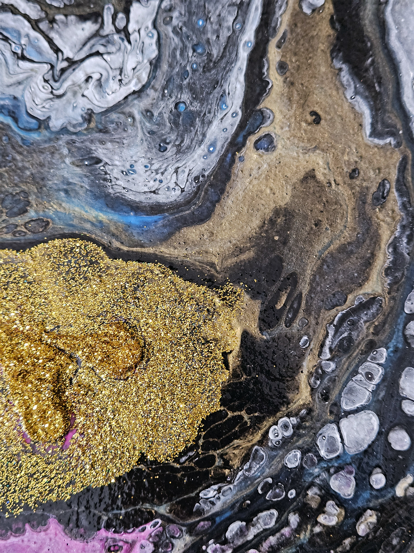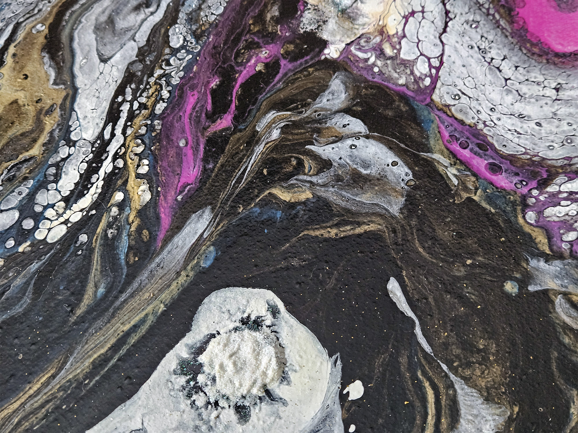 This acrylic painting is inspired by the vast unknown galaxy. Incorporating a bold blend of gold, magenta, fluorescent blue, white and black, with gold and white glitter 3D effects. Each piece is signed and comes with a certificate of authenticity.