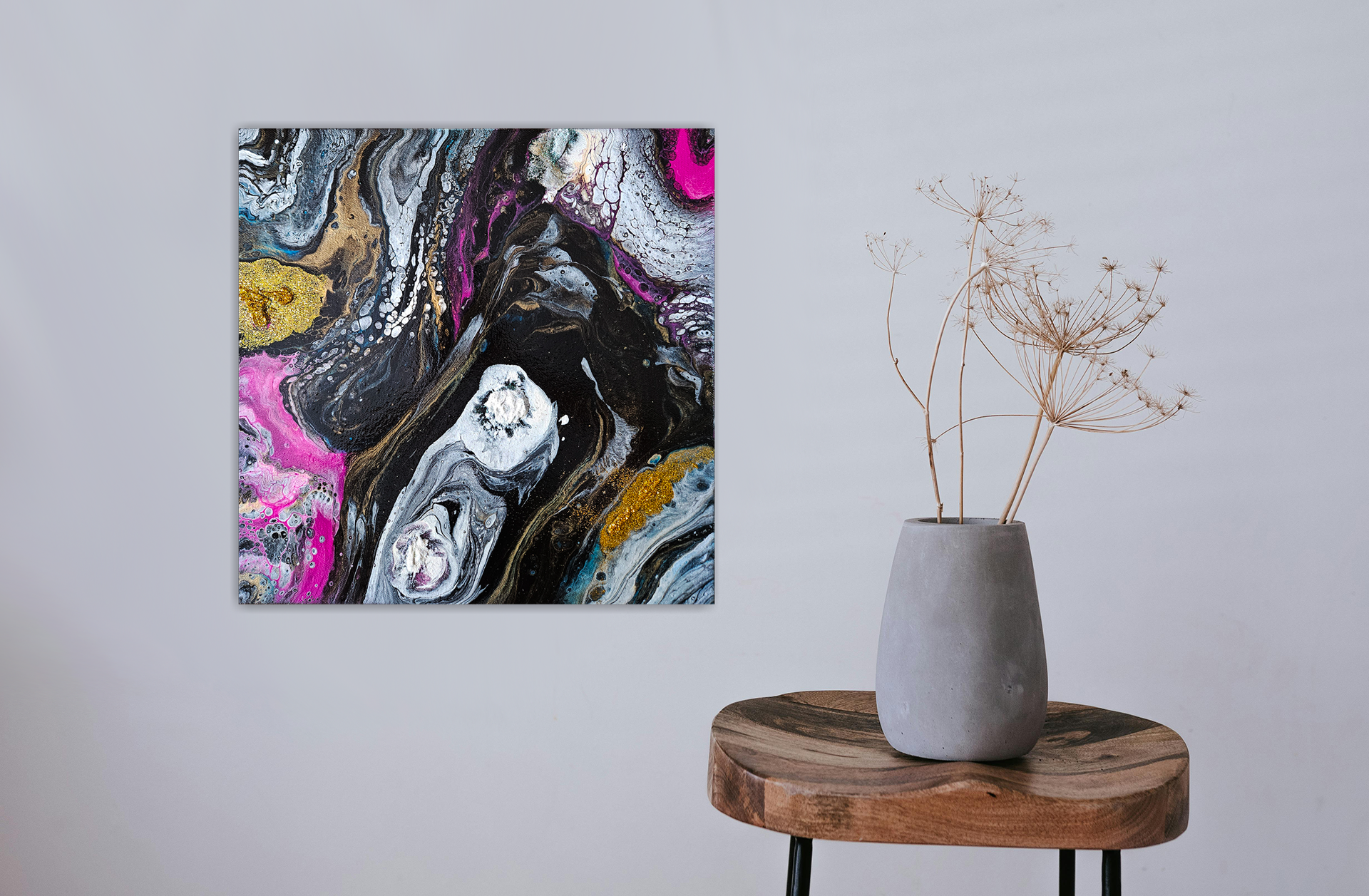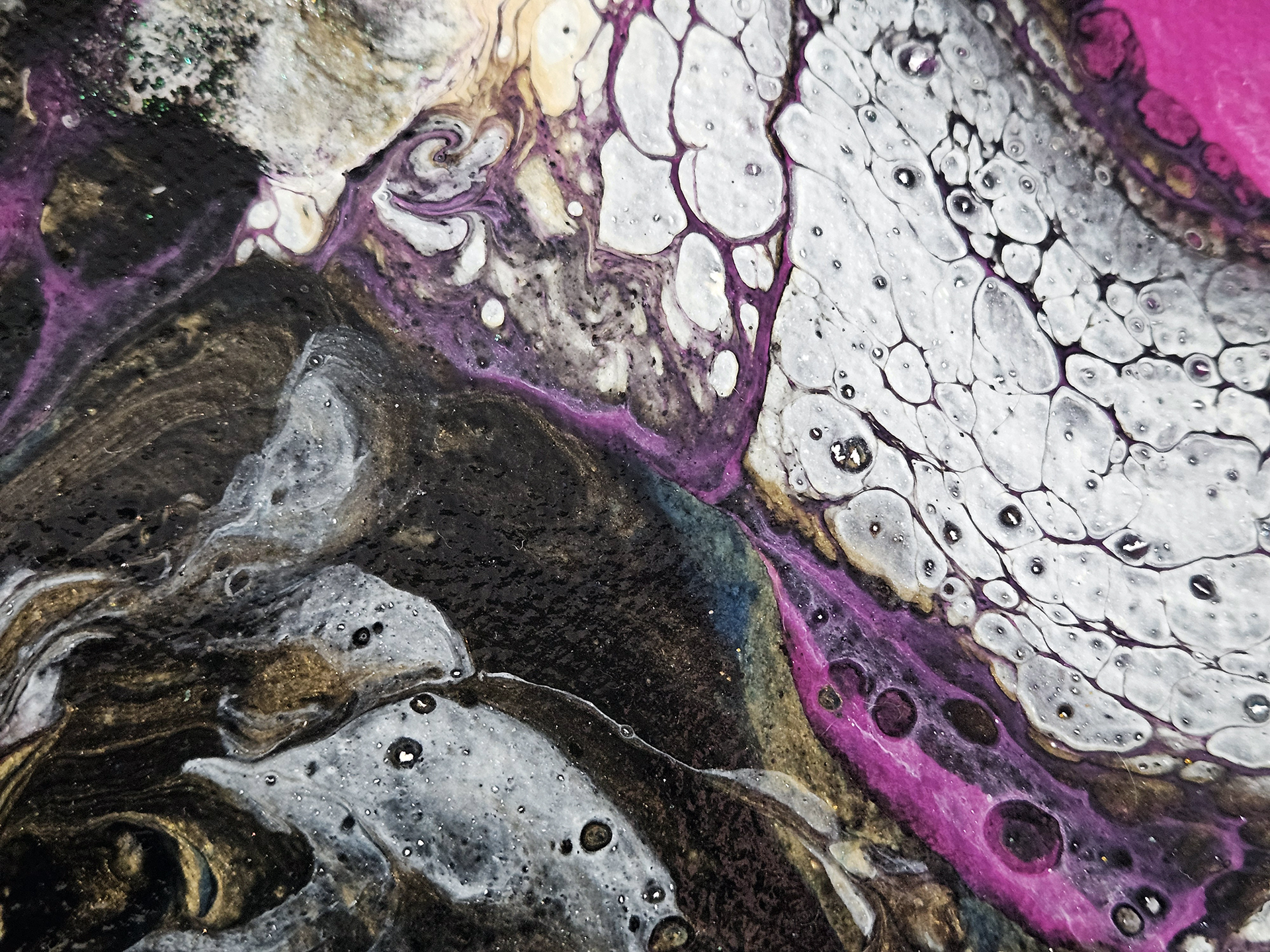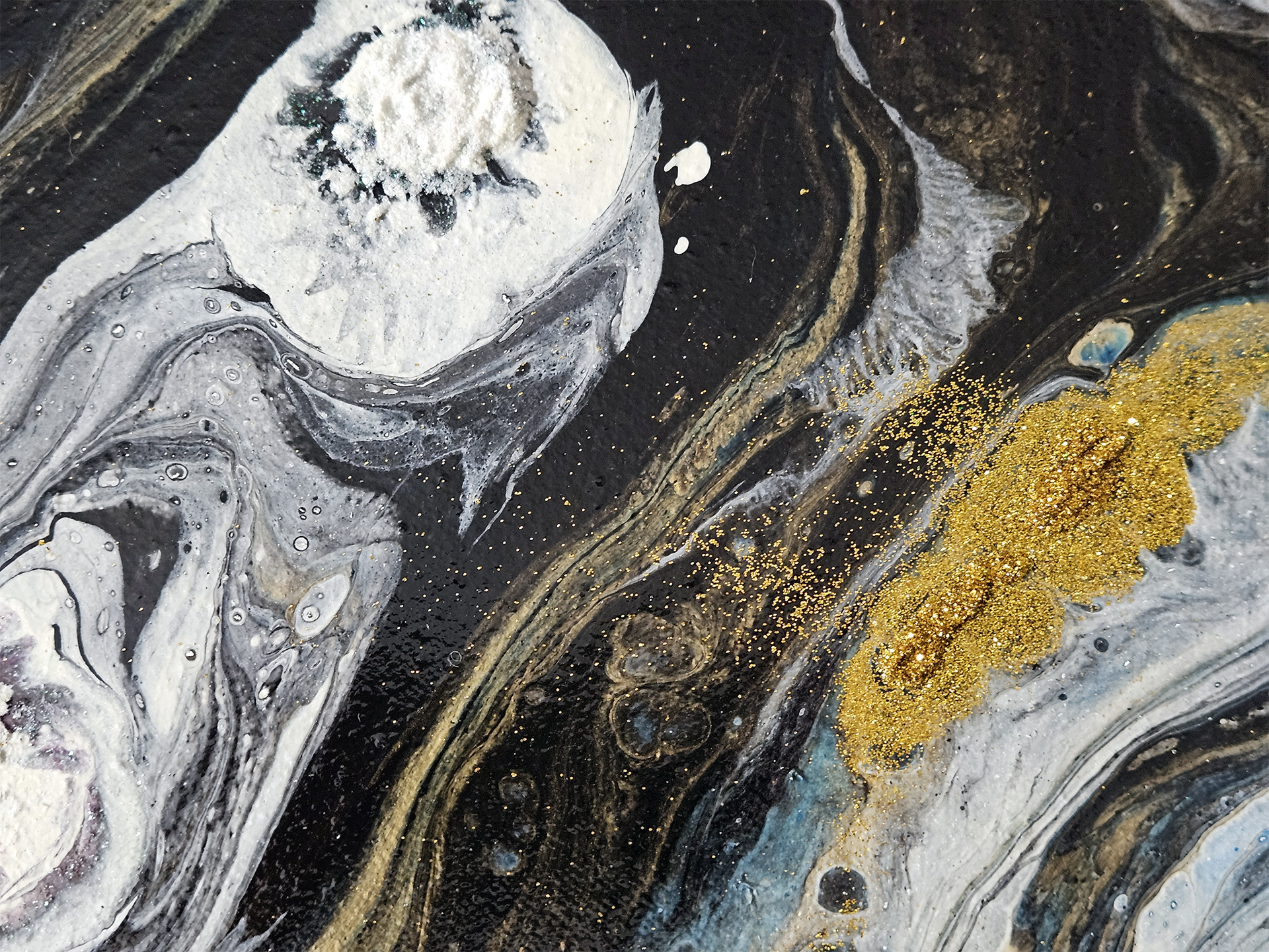 This acrylic painting is inspired by the vast unknown galaxy. Incorporating a bold blend of gold, magenta, fluorescent blue, white and black, with gold and white glitter 3D effects. Each piece is signed and comes with a certificate of authenticity.