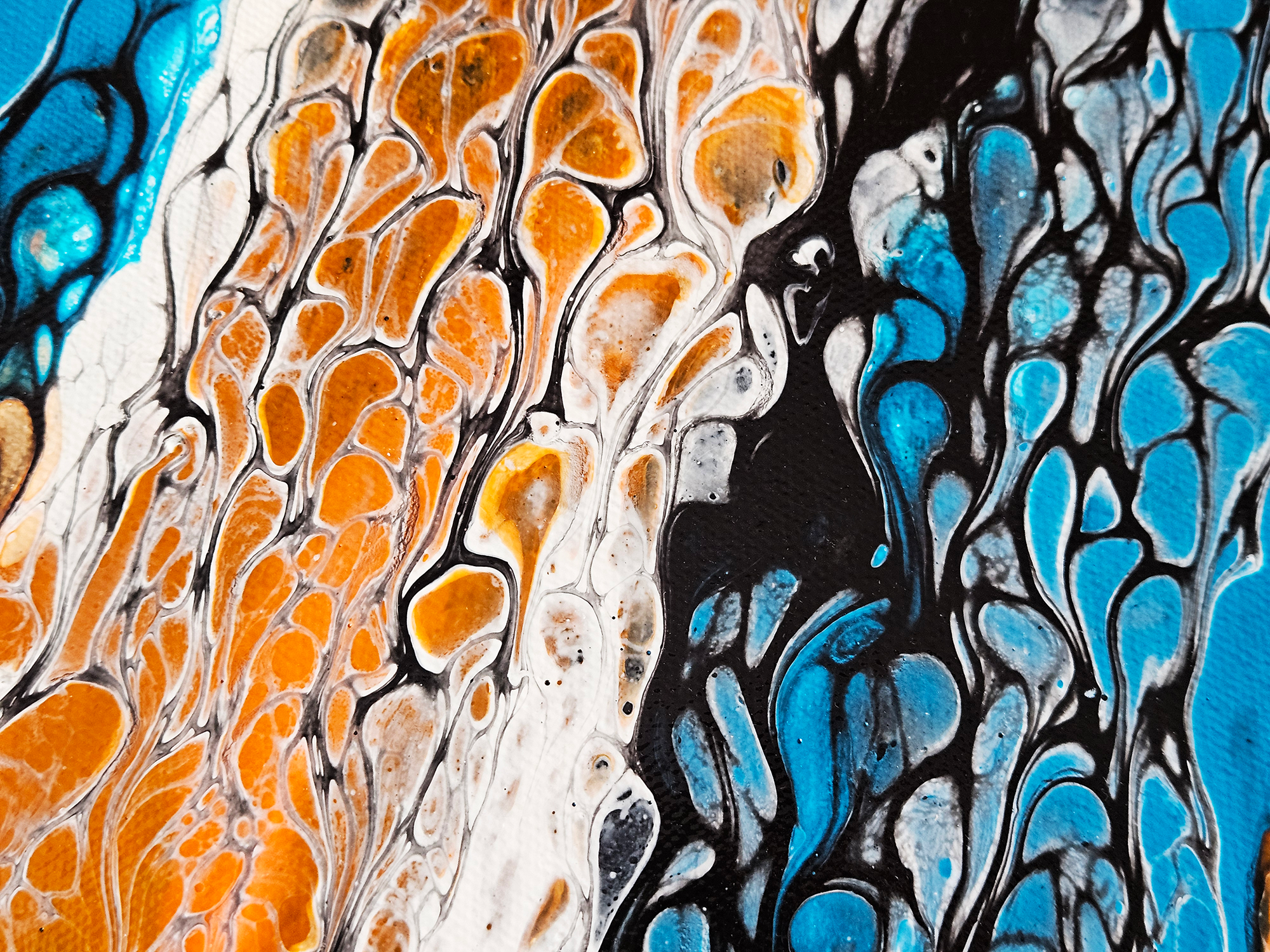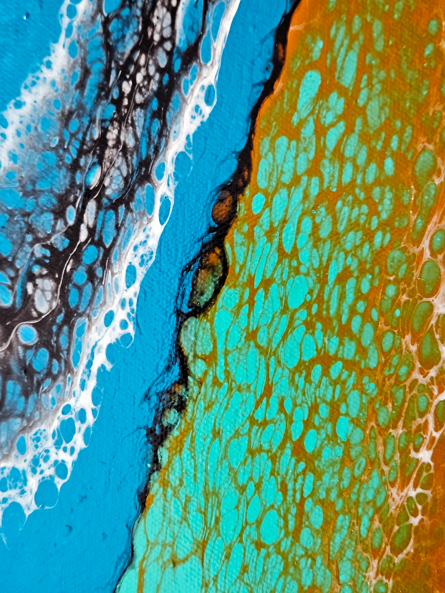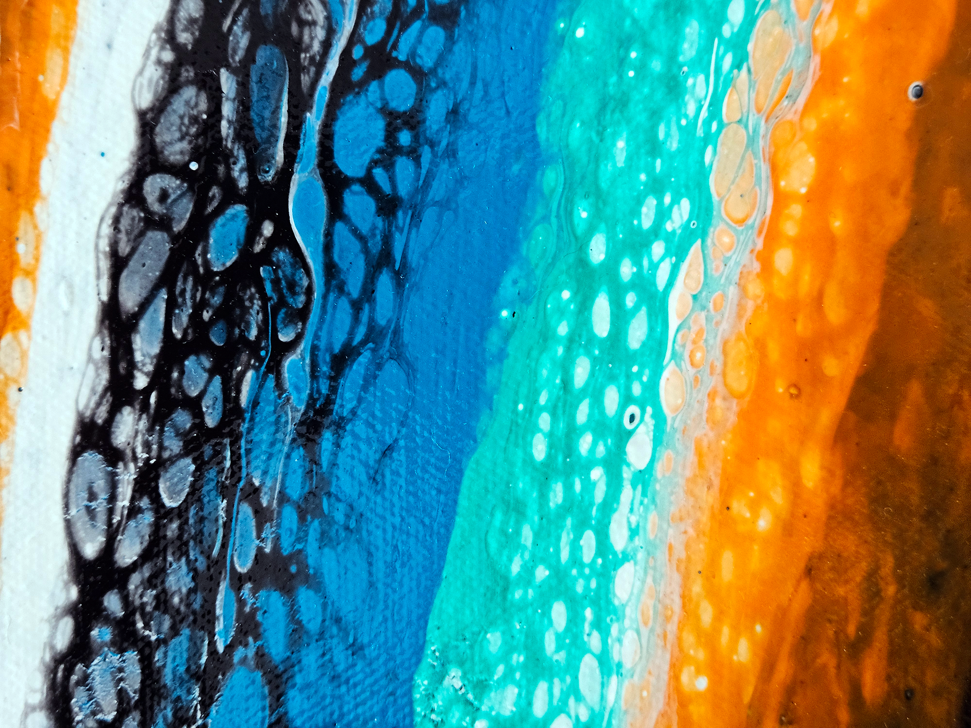 This acrylic painting by Robin Signature Creations™ represents openness. Incorporating a bold blend of vivid orange, turquoise blue, light blue, emerald green, bright aqua green, gold, white and black. Each piece is signed and comes with a certificate of authenticity.