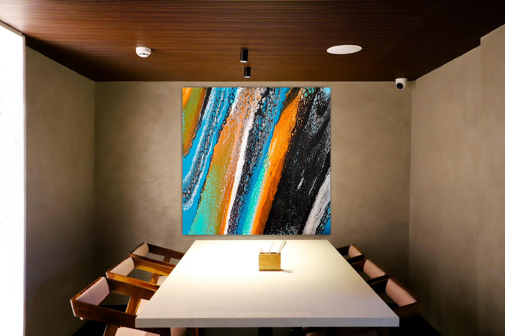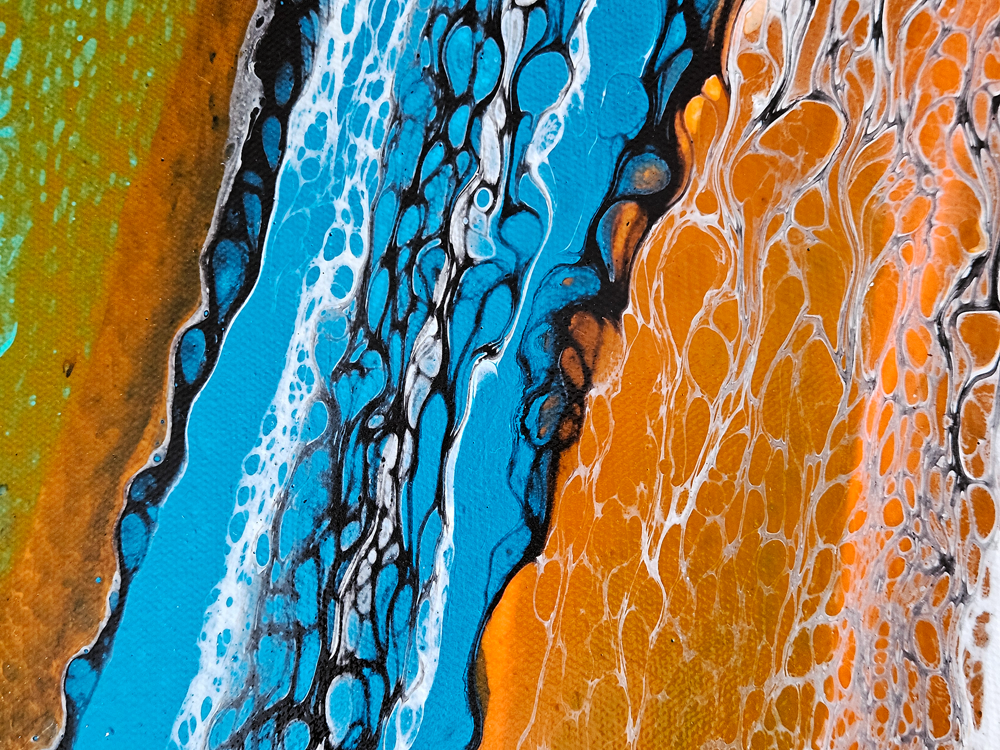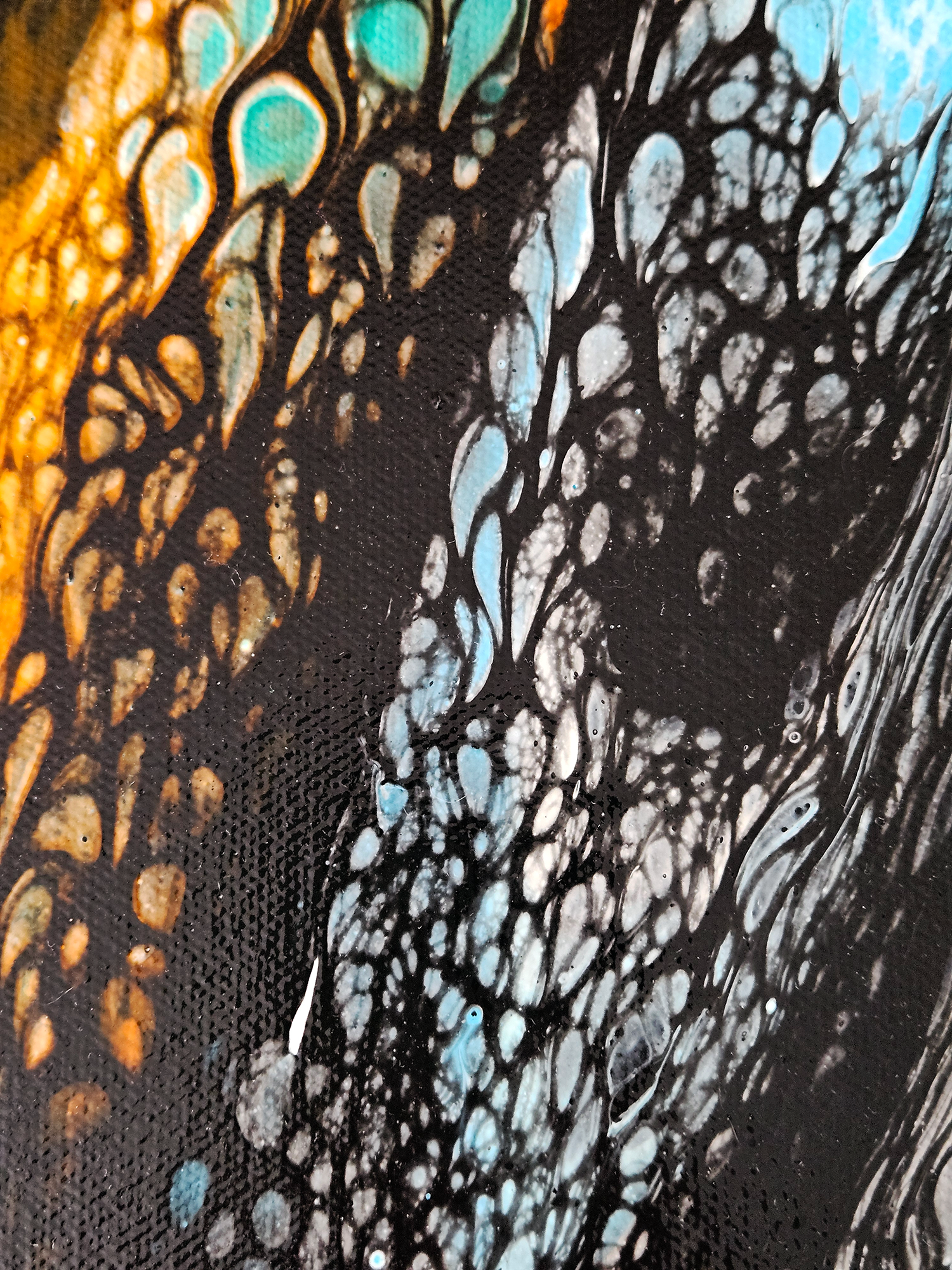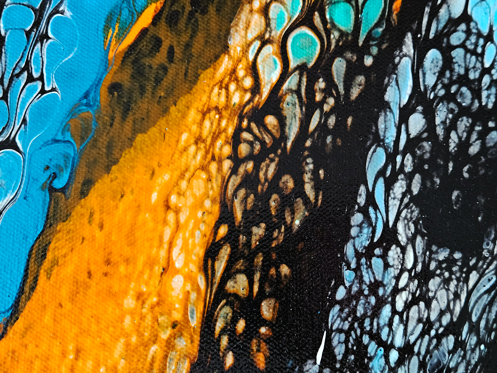 This acrylic painting by Robin Signature Creations™ represents openness. Incorporating a bold blend of vivid orange, turquoise blue, light blue, emerald green, bright aqua green, gold, white and black. Each piece is signed and comes with a certificate of authenticity.