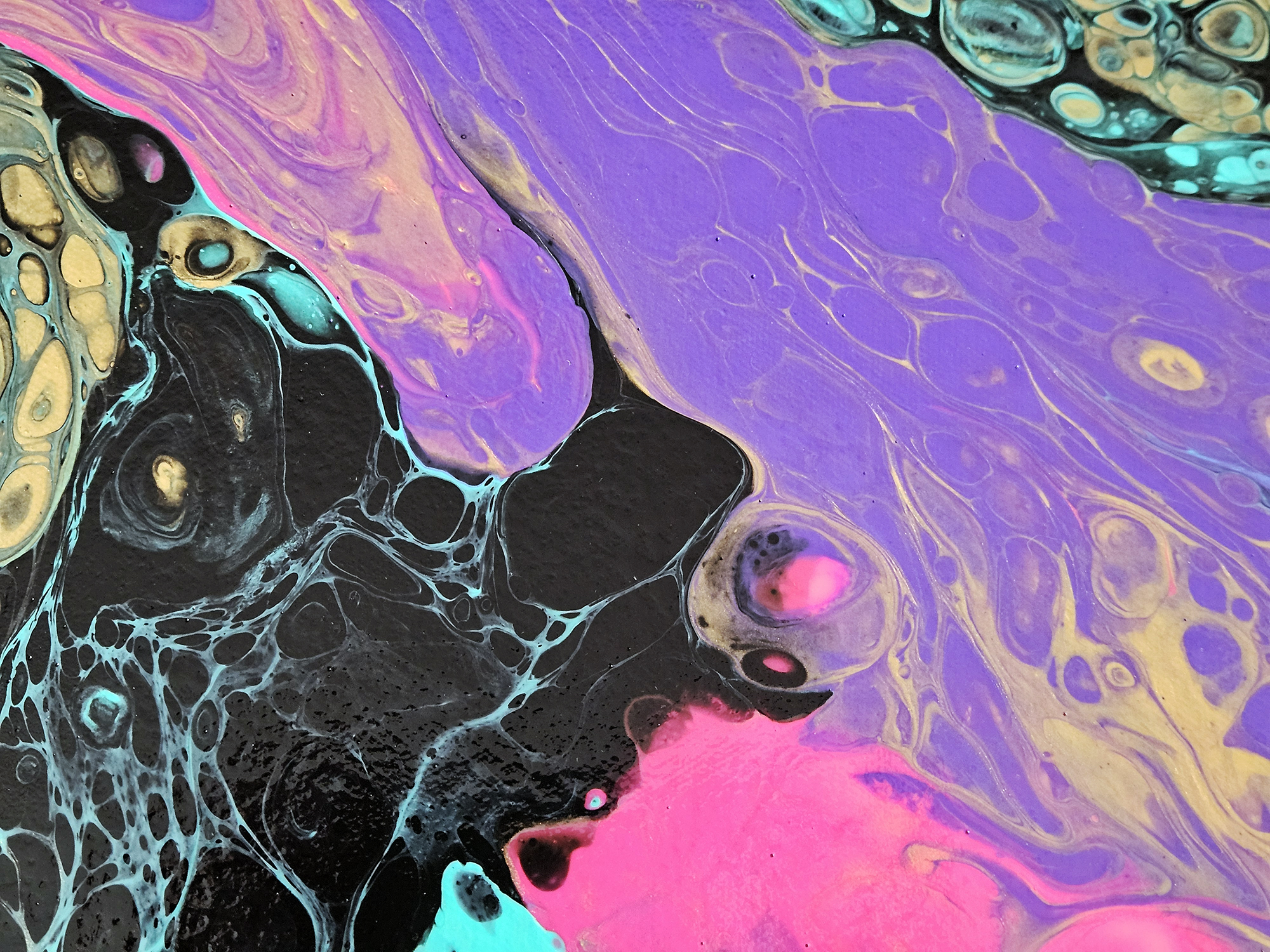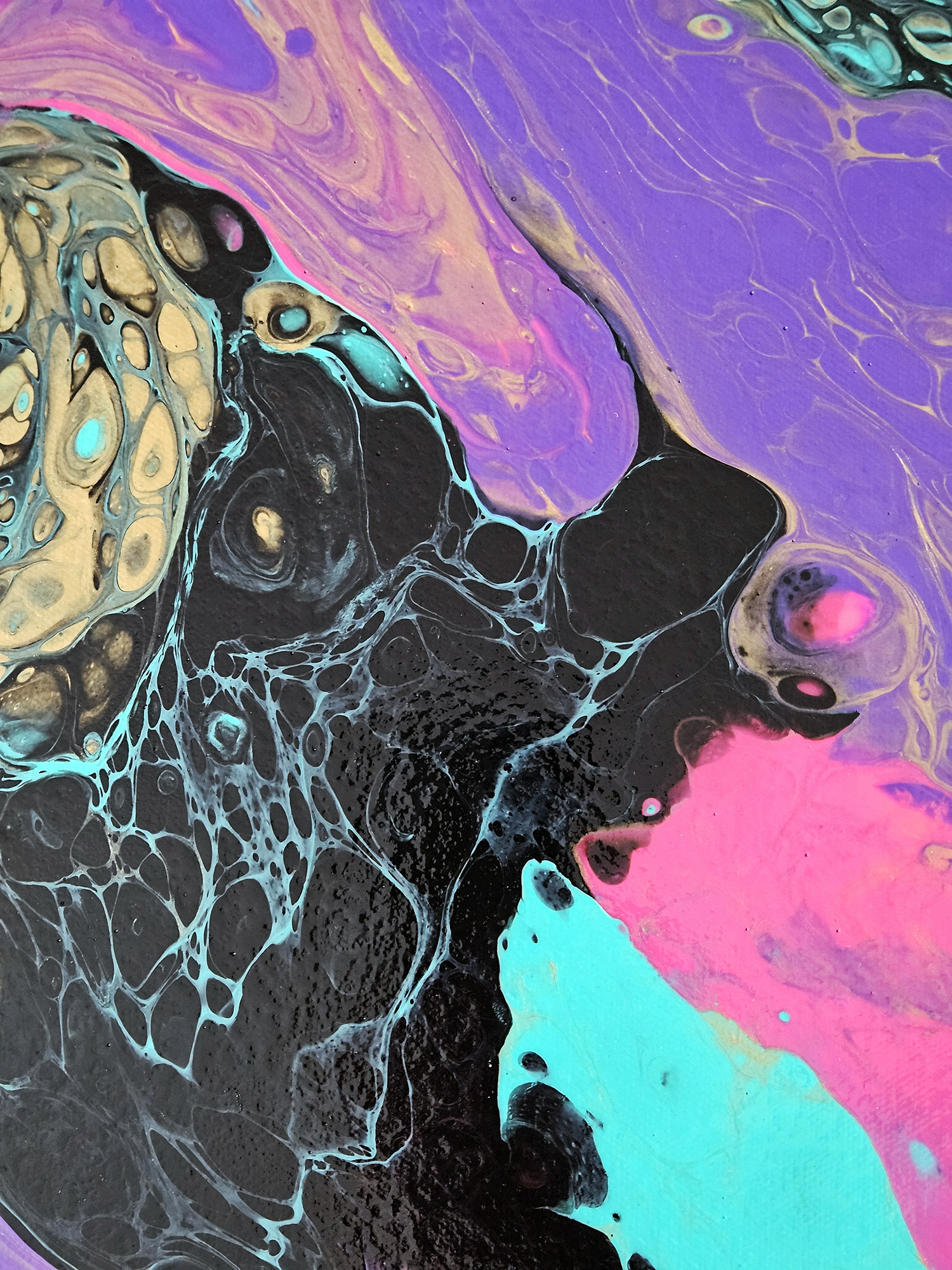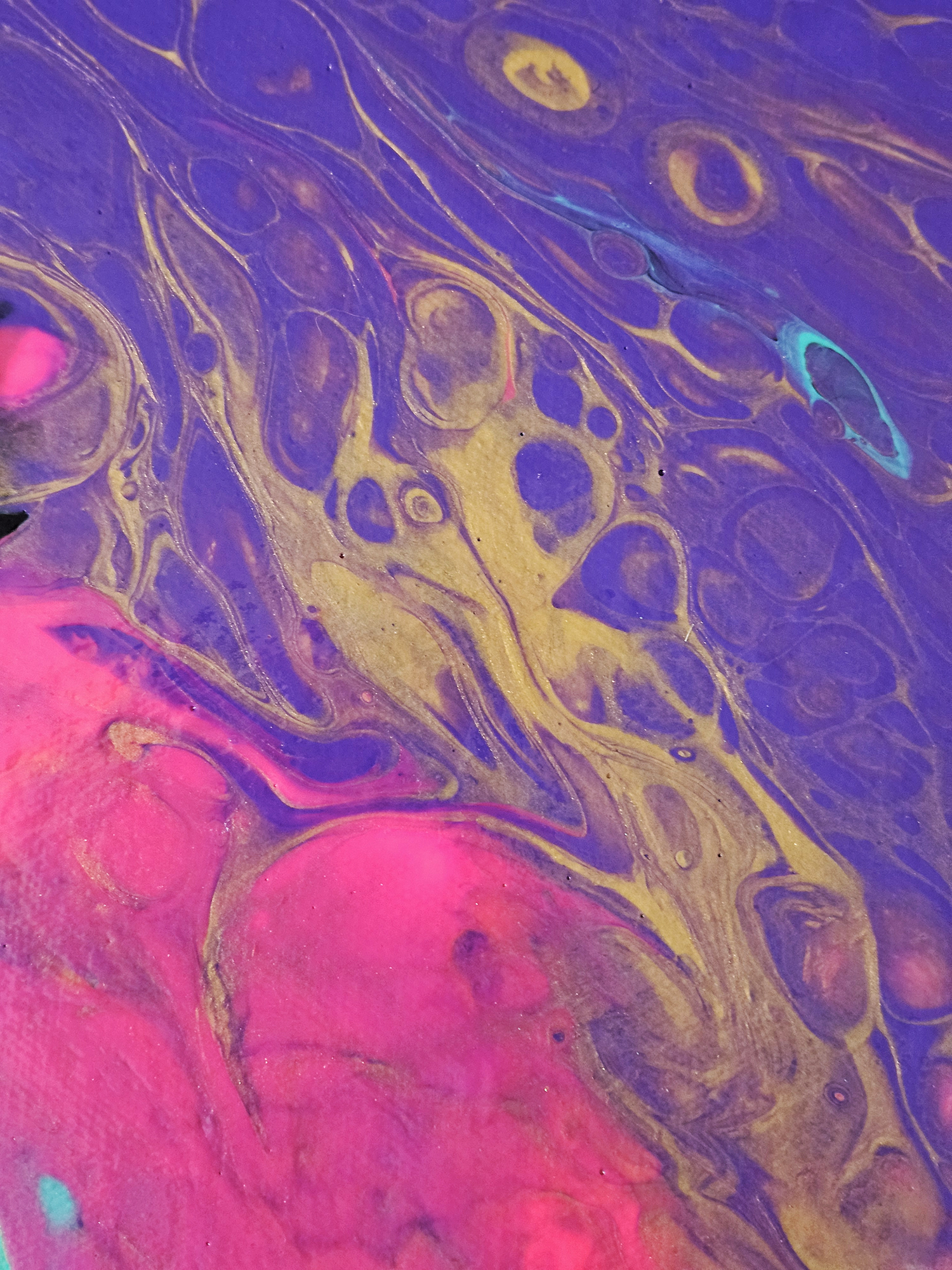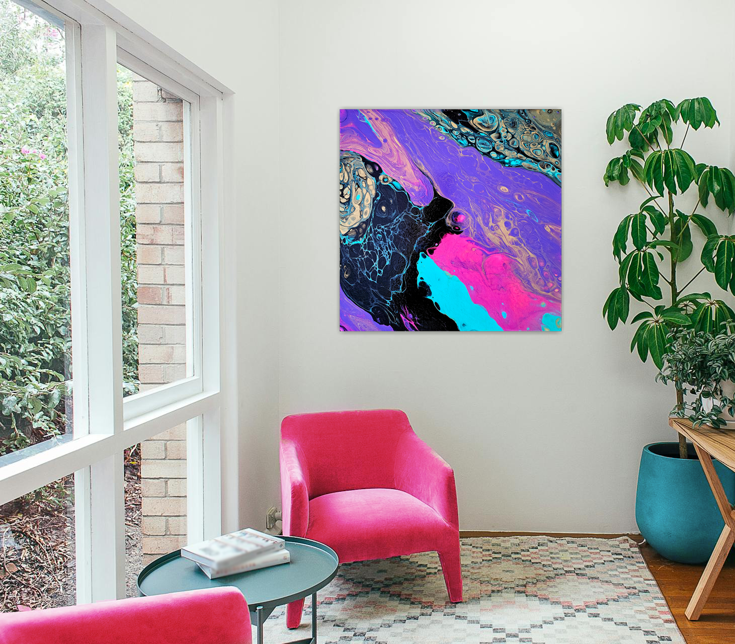 This acrylic painting is inspired by unicorns. Incorporating a bold blend of fluorescent pink, purple, bright aqua green, black and gold. Each piece is signed and comes with a certificate of authenticity.